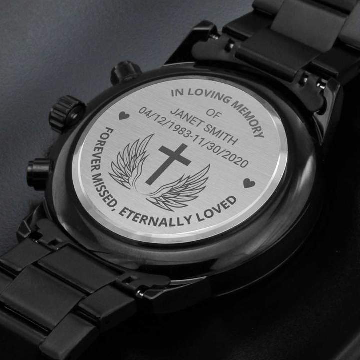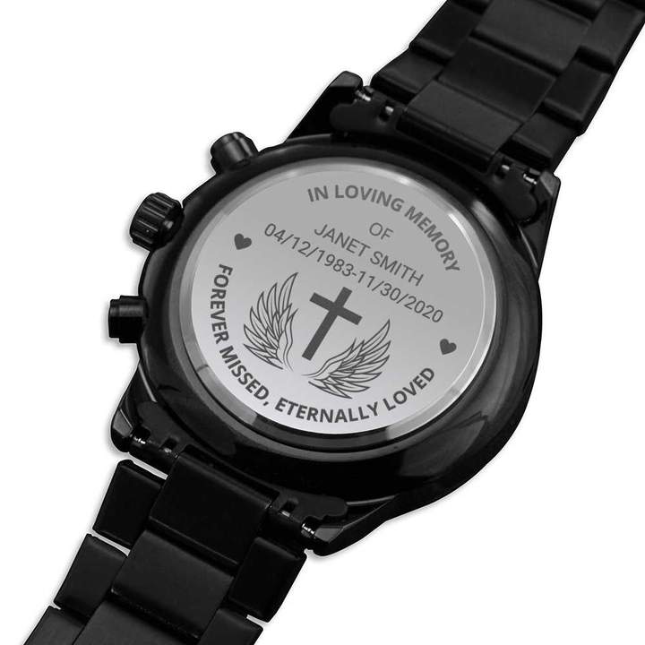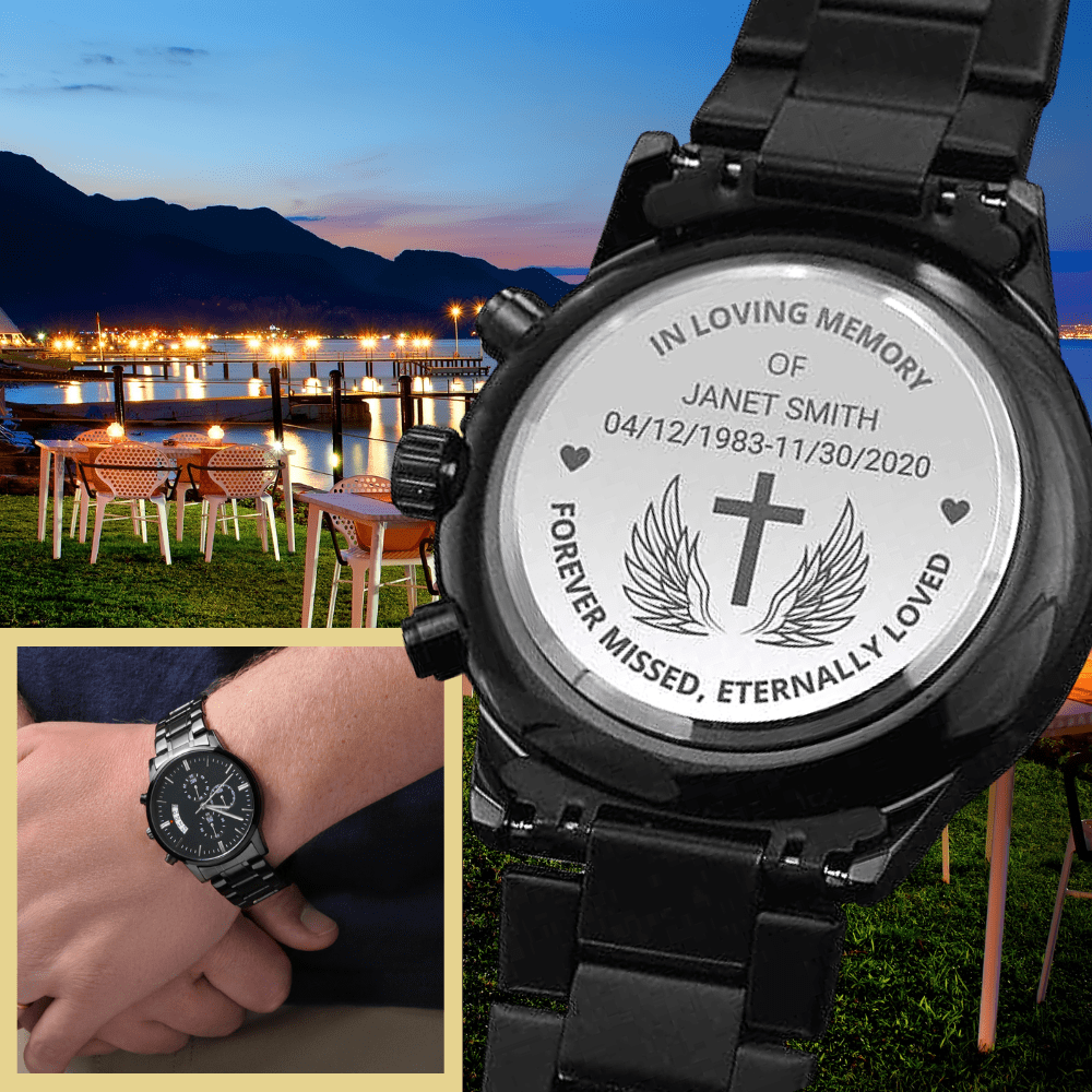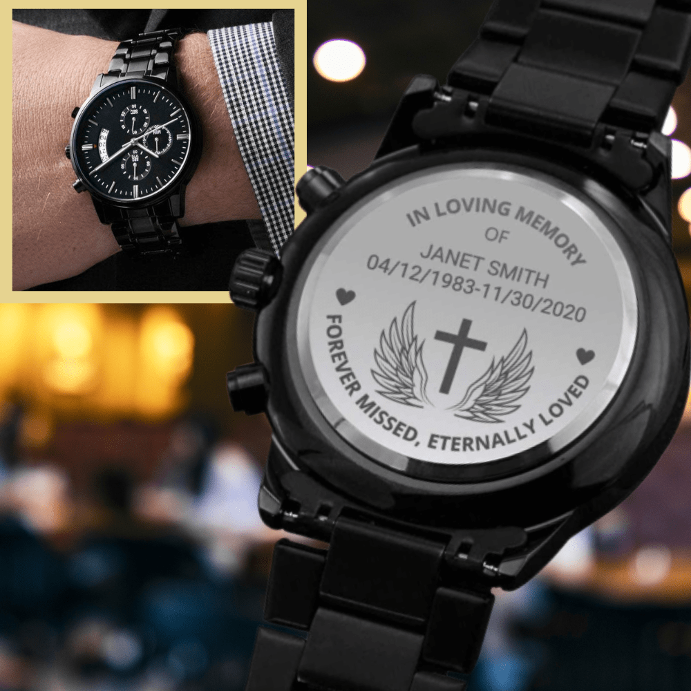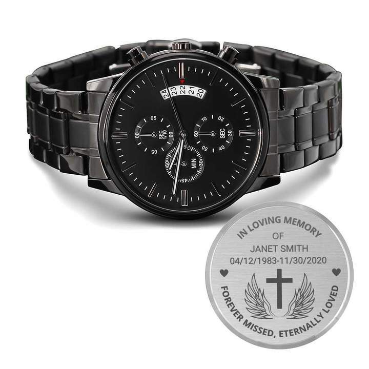 This Black Chronograph Memorial Gift Watch is the perfect gift for all the special men in your life to remember a loved one. Customize the back with the Name and Dates to remember or honor the memory of a loved one.