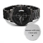 • A personalized gift that can withstand constant use, this Engraved Design Black Chronograph Watch is the perfect gift for all the special men in your life. A thoughtful groomsmen gift, an anniversary memento, or a long-lasting keepsake for Father’s Day - it's a versatile piece sure to warm hearts and create smiles. Featuring a three-dial face, calendar function, and luxury pointer in a water-resistant and scratch-proof vessel.