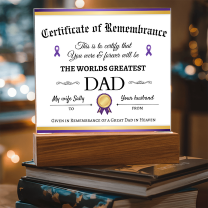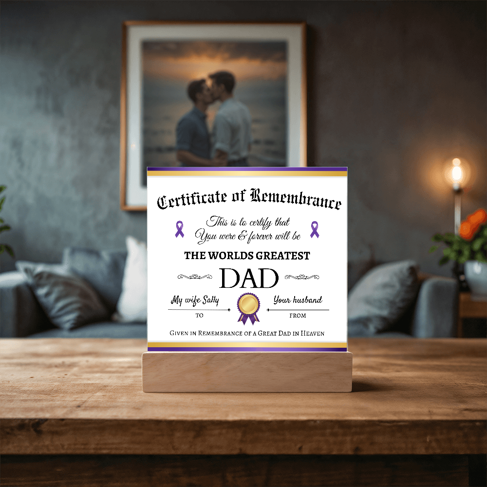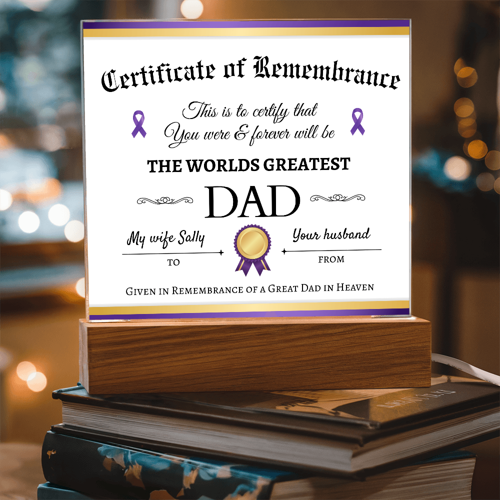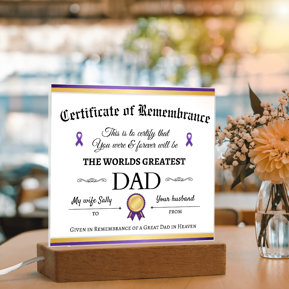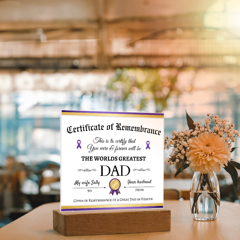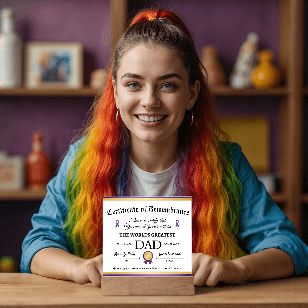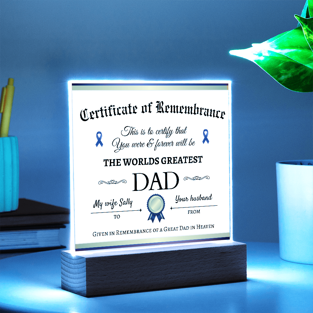 Your plaque will be crafted from premium acrylic with a professionally printed design for a polished look. It comes with a stylish wooden LED base, and you can choose between a USB plug-in option OR a cordless battery-operated option (requires 2 AAA batteries, not included). Both LED bases feature 7 vibrant colors, allowing the user to customize the lighting with various color changes and dynamic cycles.