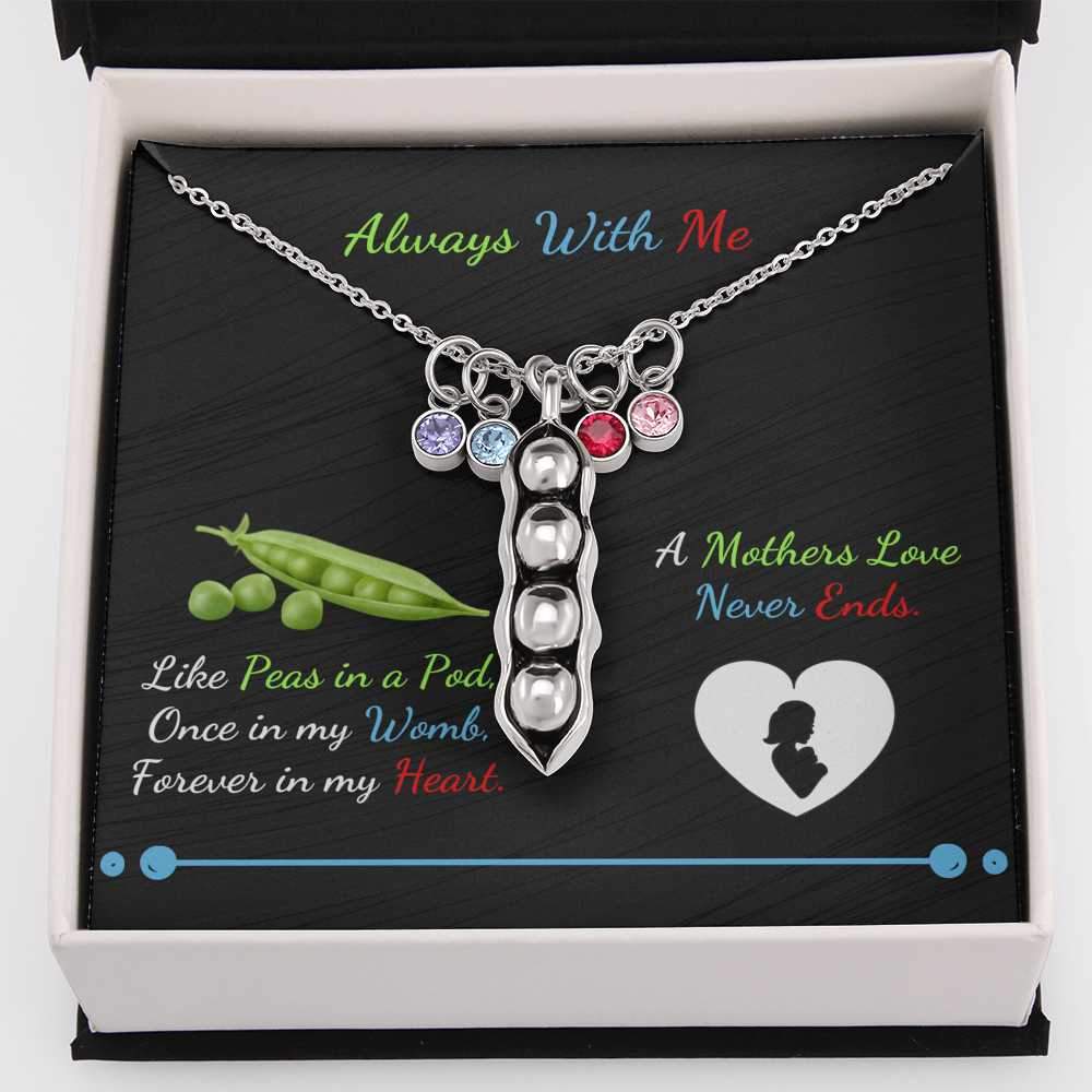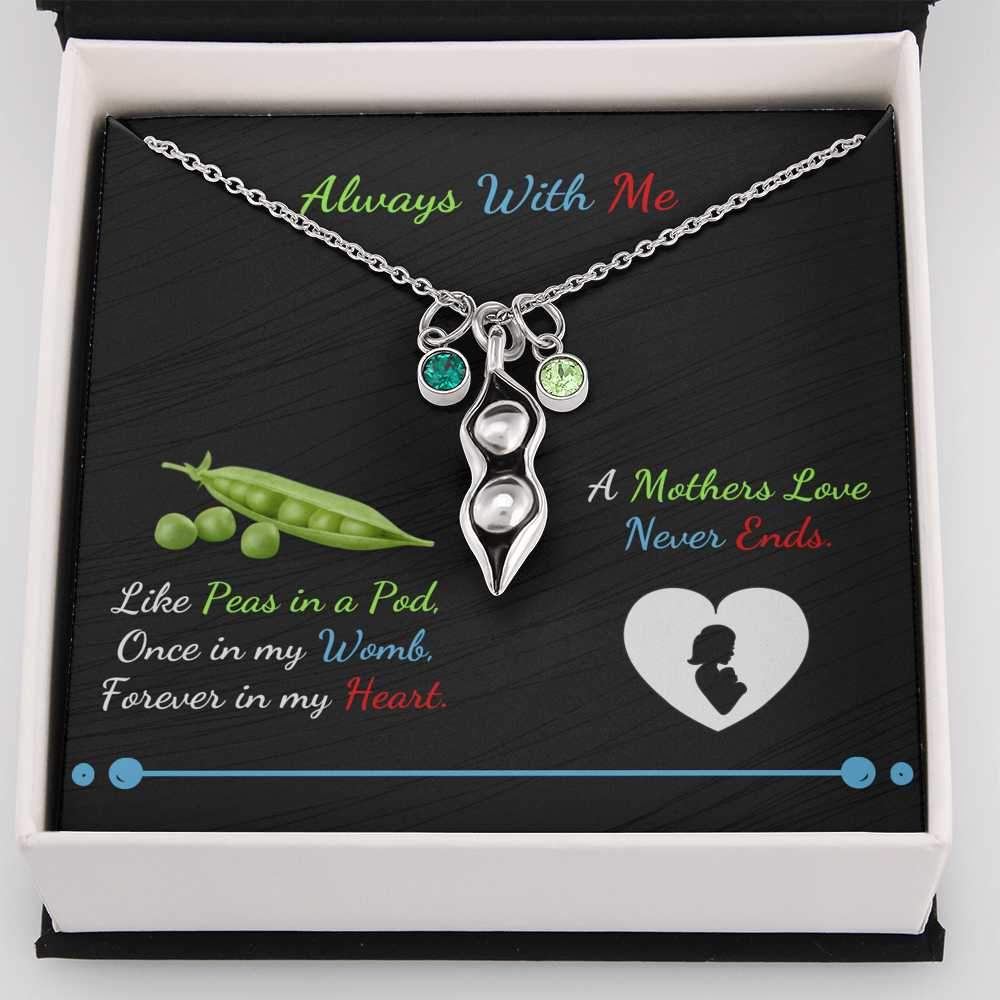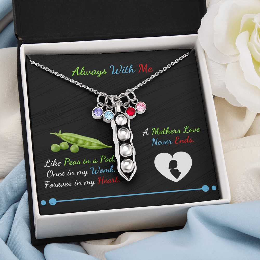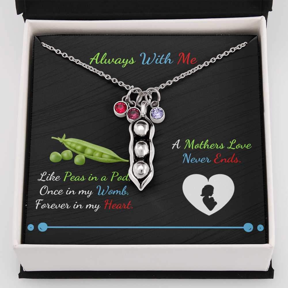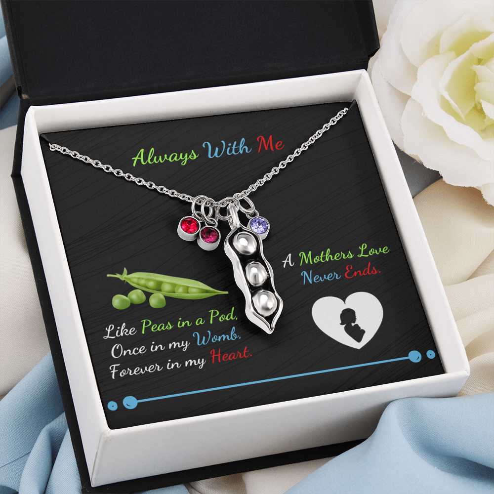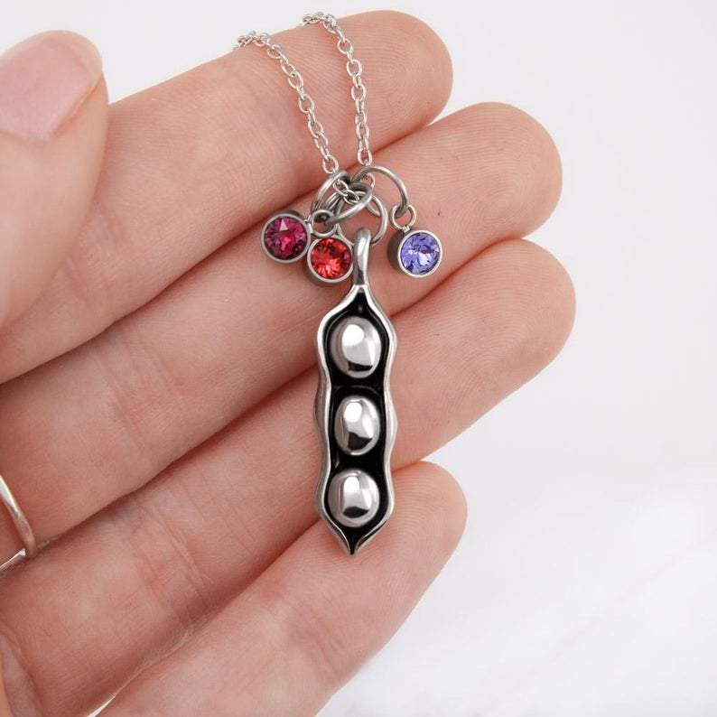 Customizable with your selection of two, three, or four peas and your selection of sparkling Swarovski® Cubic Zirconia birthstone(s); this necklace is a gentle reminder of relationships that stick around forever.